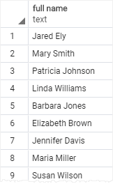The following query returns the full names of all customers. It constructs the full name by concatenating the first name, space, and the last name:
